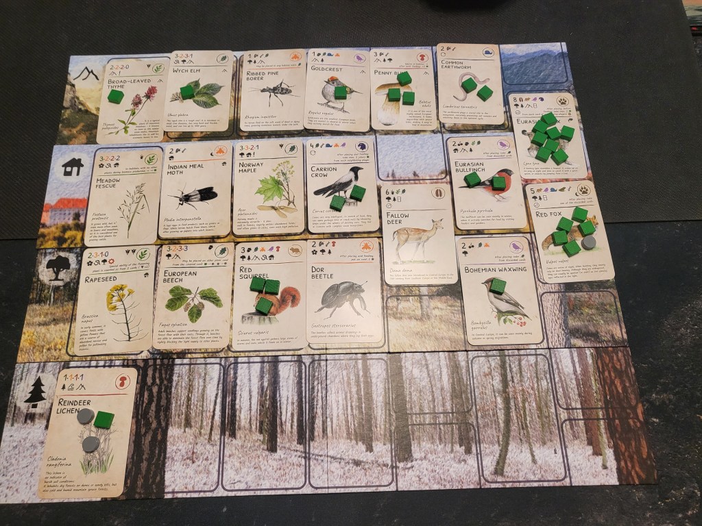It took me a few games to fully play correctly, but since the mechanics are so well integrated into the theme, it all makes ecosystemic sense, so it’s easy to understand and fall into the rhythm of the game.