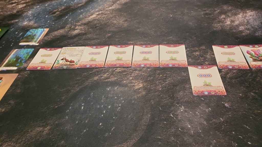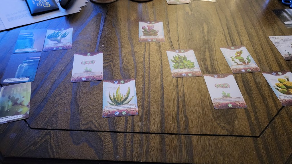 critter AND in three consecutive columns is brilliant. I didn’t mention this during my overview, but succulents provide more resources than the standard card (what the game calls “soil side up”), so the more you grow, the more resources become available. The glass card element creates an interesting additional layer of strategy as well. All these incredible design choices come together to form a delightful and challenging game.