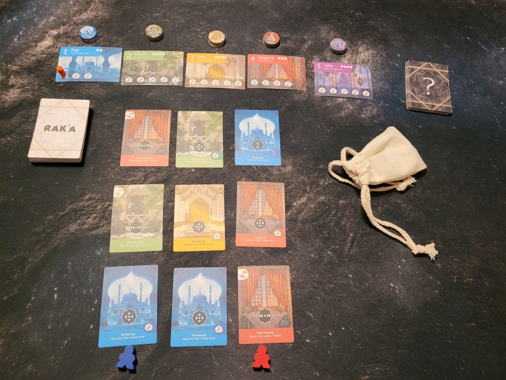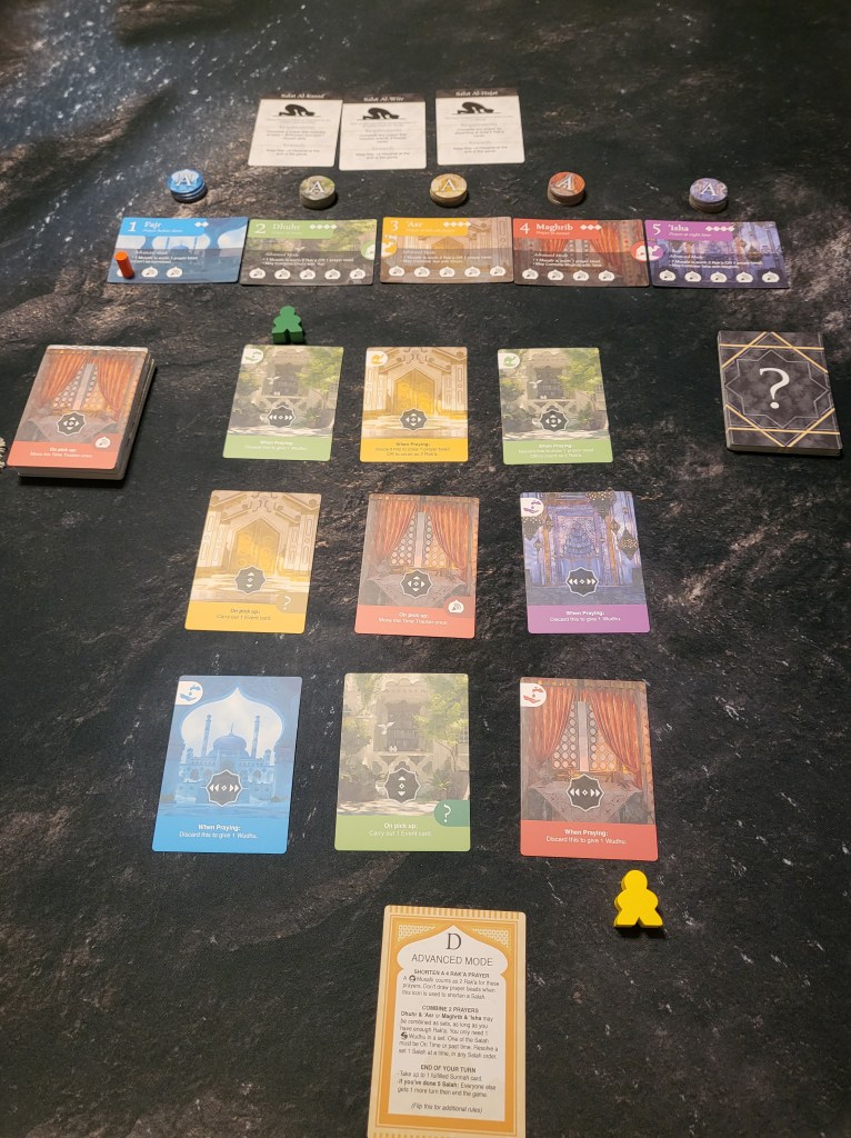 In U’solli, players attempt to pray all five Salah before the end of the day. To do so, Rak’a cards get collected from a general market of sorts (rows and columns of face up cards) and then sets of similar colors can be discarded to pray the prayer associated with that color. This means that every round players decide whether to move and gain a card from the market area or discard cards to pray.
