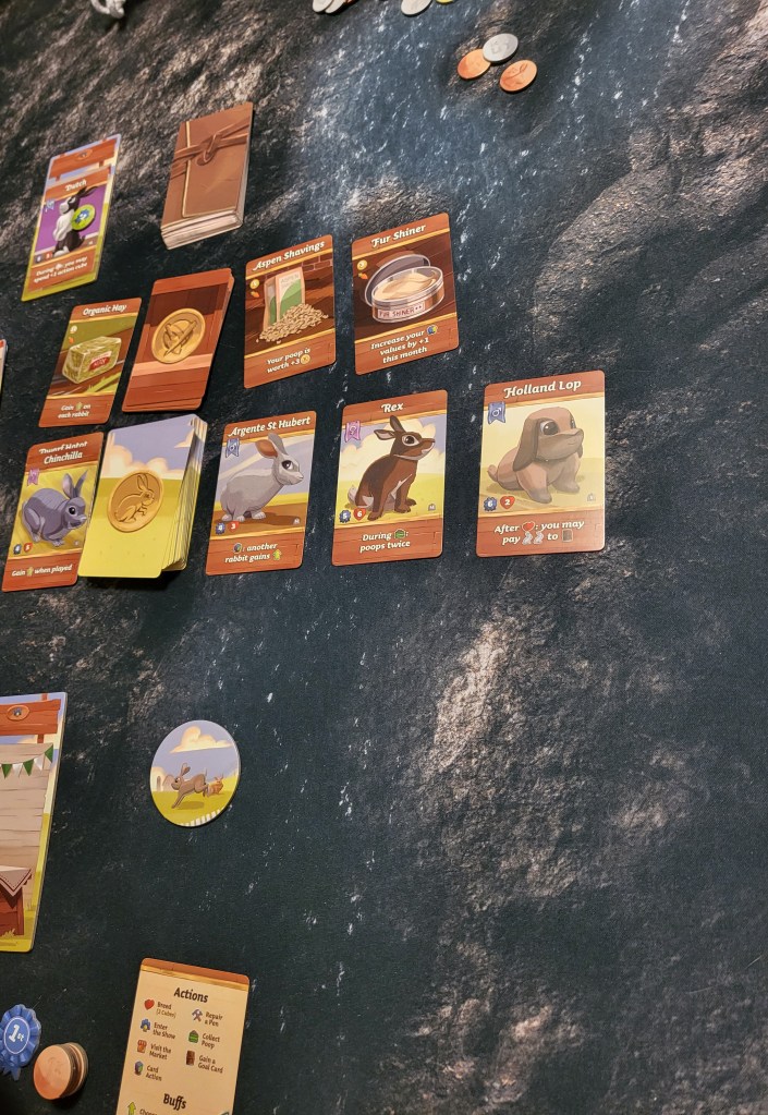 Once everyone has at least one bunny, the months begin. There are six months in the game and each player gets one turn per month. On a turn, a player can use between zero and three action cubes to perform actions via their player board. Actions include drawing more goal cards, breeding bunnies, showing a rabbit, going to the market to purchase items and/or sell/buy rabbits, collecting poop (hilariously realistic), and repairing pens. There are also some bunny cards that allow players to use a cube to perform the identified action. All listed actions require one action cube except for breeding which requires two. There are also a few free actions that can be taken at any point during a turn including playing a rabbit card, swapping cards on your board(s), and removing a rabbit card from a board and returning it back to hand. As one player finishes their turn, rabbits in the market are refilled but any purchased items do not get replenished until the end of the round. Then, play passes to the next player clockwise. The end of the round comes at the conclusion of the final player’s turn.