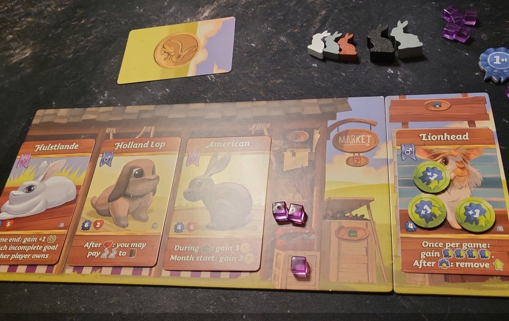 Play continues over six rounds/months with each round ending with the Hop Token (first player token) moving to the next clockwise player and beginning with a Bunny Bulletin card, the market getting refreshed, etc. At the end of the game, players score points based on any bunnies from breeding, complete hidden goals/objectives, all first, second, and third place show ribbons, and one point is received per three karats remaining. The player with the most points wins!