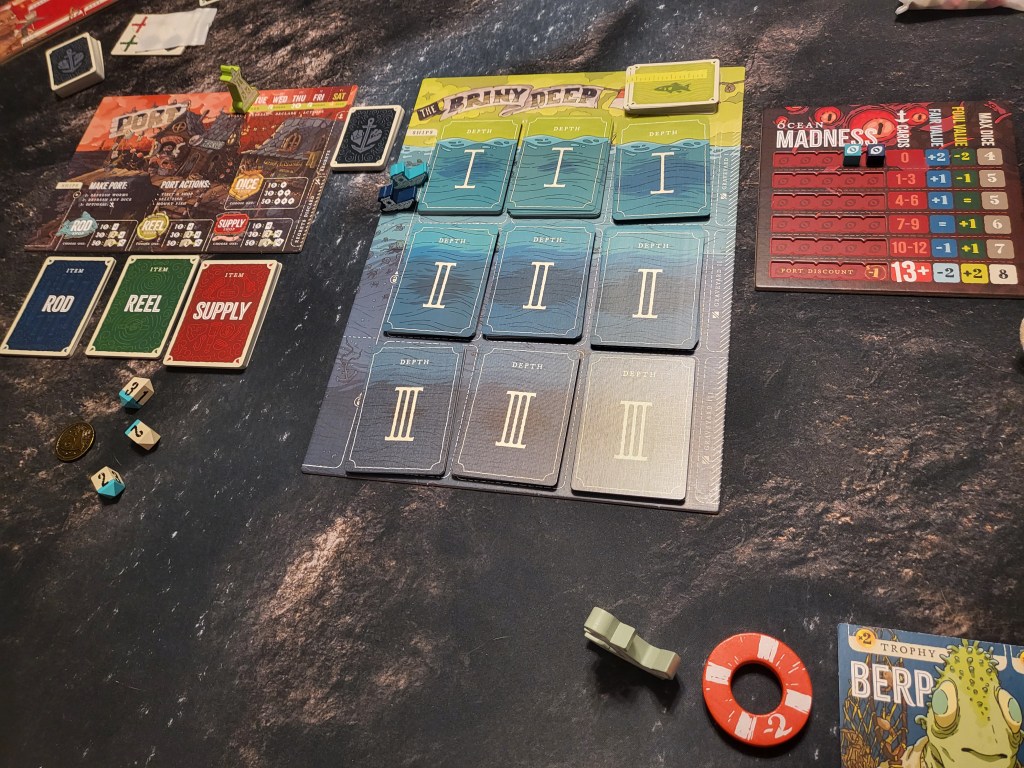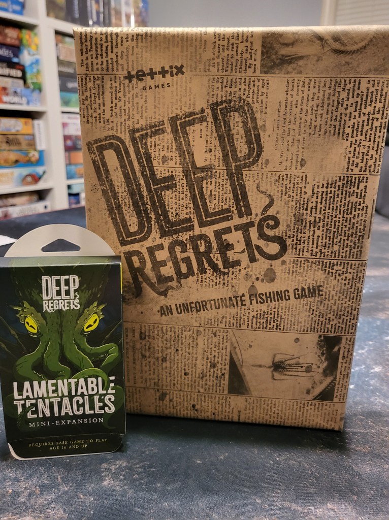 Deep Regrets is an original, goofy, strategic, fun game about regrets, fishing, monsters, and more! The solo game and multiplayer game play very differently, so this review will essentially be separated into two parts. Overall, though, this game is a keeper!