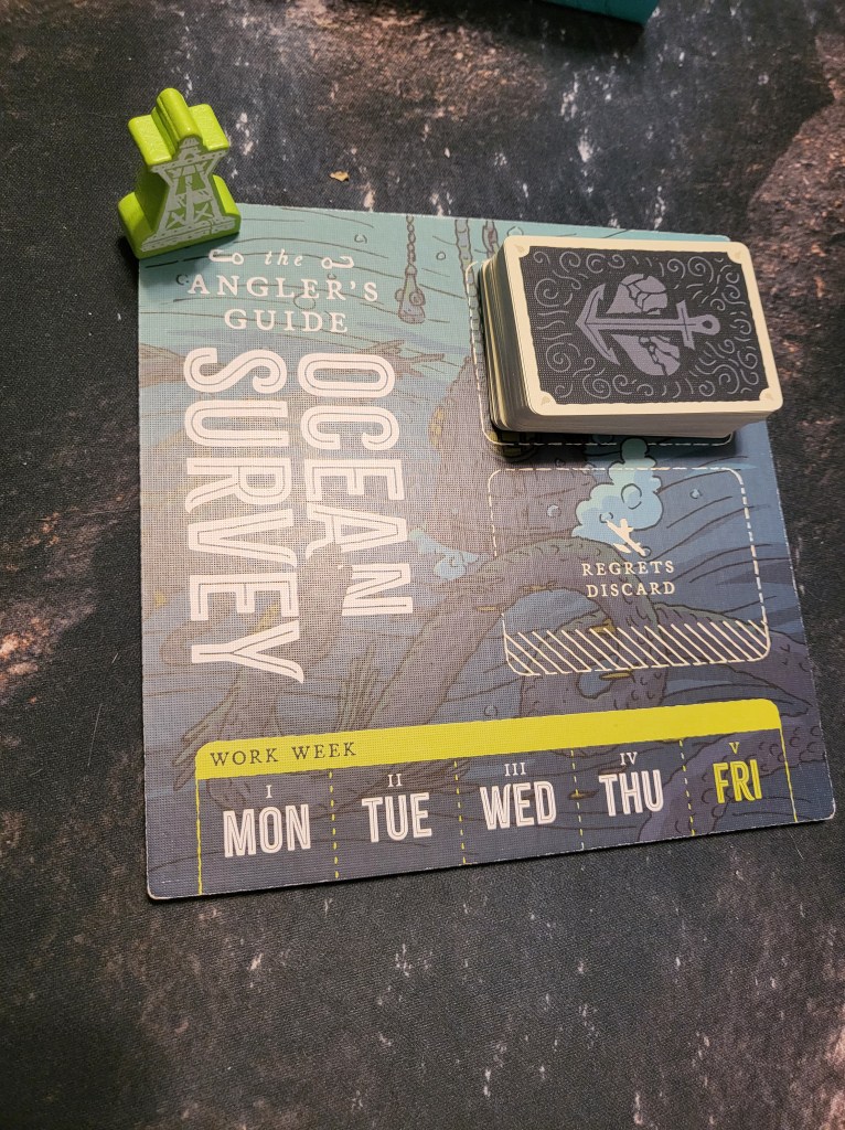 In the solo game, after the five days of rolling dice and fishing, the player returns to shore and tries to catalog all their fish. If any regret cards remain in hand, however, fish must be discarded (jettisoned thematically) in any combination with a total value (collectively) that is equal to or greater than your total value of regrets. This means it’s possible to catch a fish but still have to re-catch it later and try to haul it in; all for the sake of science of course.
