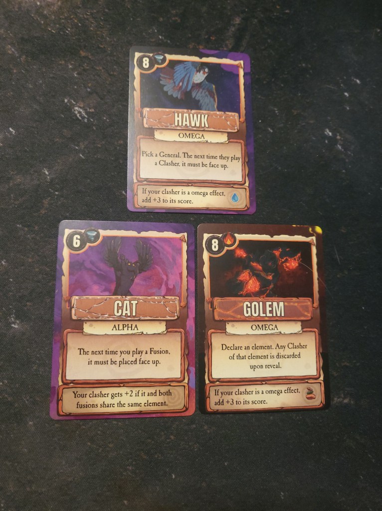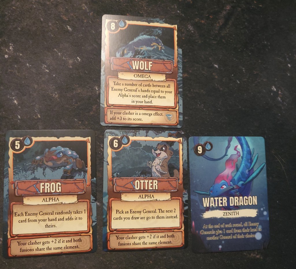 From their seven cards, each player selects one card to be their Clasher. This is their main battler for the round and plays it face down in front of them. The only parts of this card that matter are the value and element; none of the effects will be utilized that round in play. Then, each player also chooses cards to form a fusion for their clasher. A fusion can consist of an Alpha and an Omega card or two Alpha cards and a Zenith card. The Alphas typically have a sacrifice-type effect for the player while the Omegas are typically beneficial. The Zenith cards have abilities that (after played) become continual in the game until that card gets replaced. From our experience, these seem to be more directly negative to an opponent or opponent(s). These fusion cards get placed face down below your Clasher.