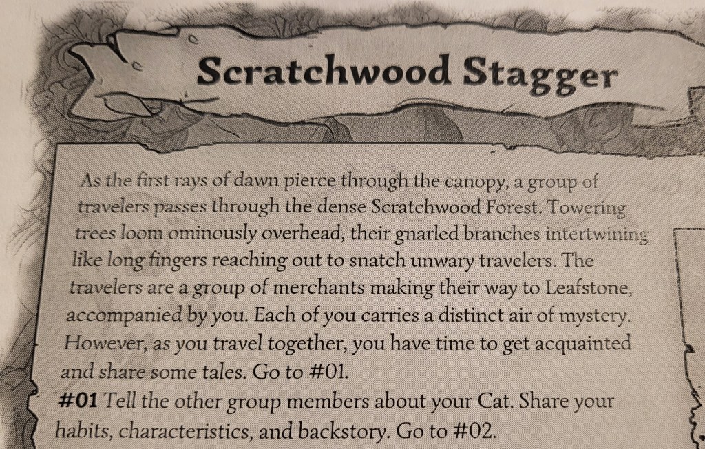 Once each player has their adventurous cat at the ready, the first Saga begins. Each Saga is a series of numbered story entries that can simply relay story, have important plot points, provide choices or options, and/or challenge the characters with skill checks to win and enemies to defeat. The Sagas all begin with a bit of story (see below for a teeny spoiler of the first Saga), and then players collectively work through the entries following the instructions and performing the required actions as necessary.