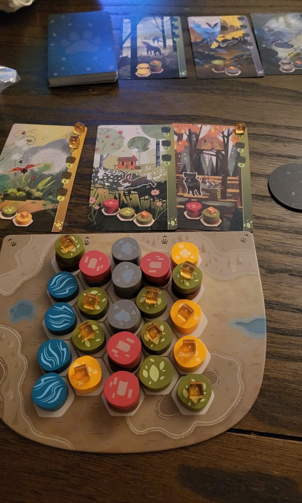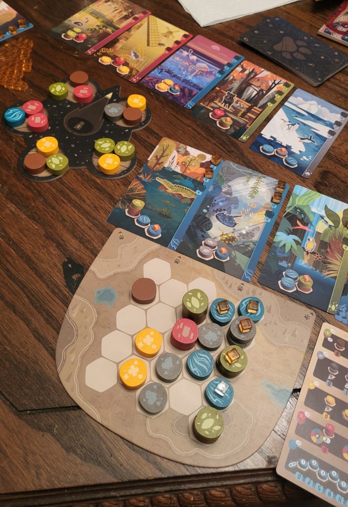 One other small caveat: there are also Nature’s Spirit animal cards you can elect to incorporate in the game. If you want to add them in, you simply deal two to each player before the game begins and they choose one to keep. These animals work similarly in terms of needing a specific pattern, but they only have one cube, so once you meet the pattern, you can move that card and make space for another animal. Each Spirit card has end game scoring conditions that add an extra layer of challenge and strategy. I like playing with Spirit cards now that I know how to play, but I admire that the base game doesn’t need them because it was easier to learn (and teach) the game with the standard animal cards only.