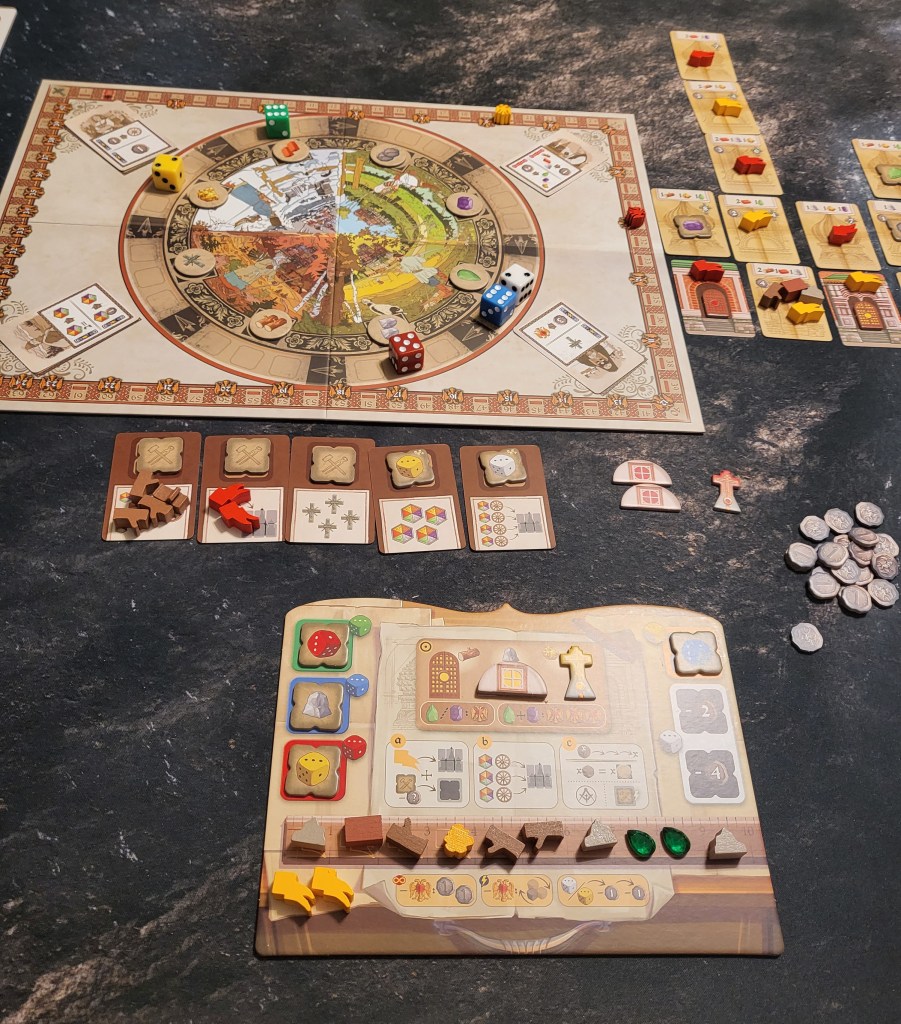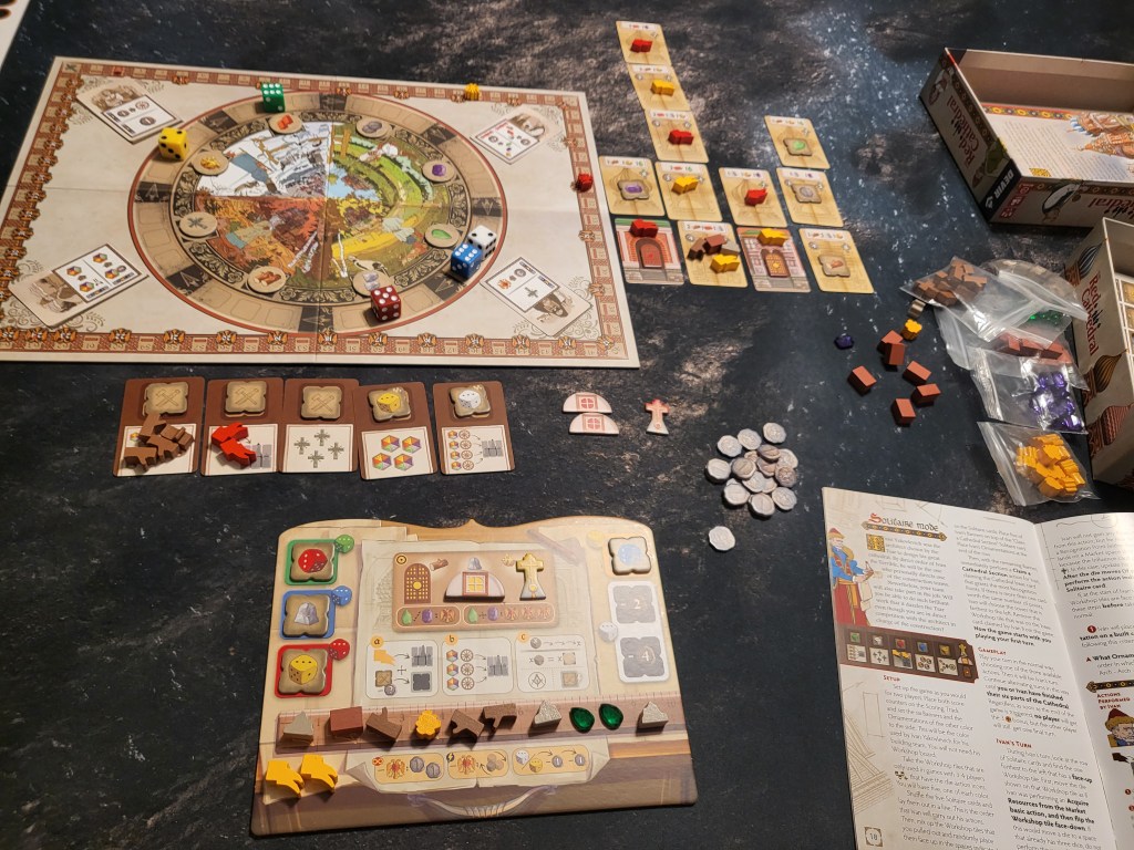 Regarding player count, it worked well both solo and with two players, but I could see this being even more interesting with more players. The time would likely increase some, but there’s enough interaction with claiming and building the cathedral, it would be fun to see how that plays out. I like that this game has solid player interaction, and while it can be directly mean, it’s not to only punish the person; you still get something out of it.
