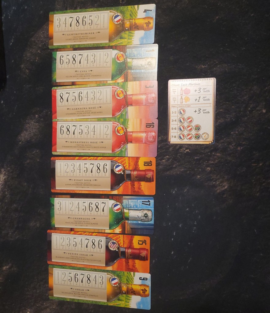 Why is this important? For scoring! Besides the points achieved based on how well your cellar aligns with the preferences of your client, you also score points from the bottles in your cellar. Each bottle features a row of eight “Age Scores” representing the quality of wine at the time of opening. Starting with the top bottle, each player scores the associated value with where it is placed in the cellar. In the example below, the Gewurztraminer scores 3 points for being in the first spot, the Cava 5, etc. all the way to the Syrah with 3 as well (basically it scores on a diagonal from top left to bottom right).
