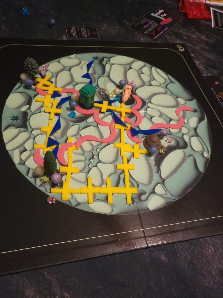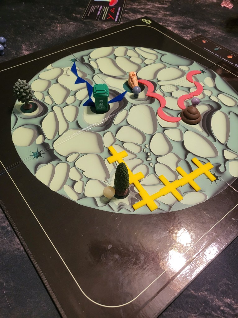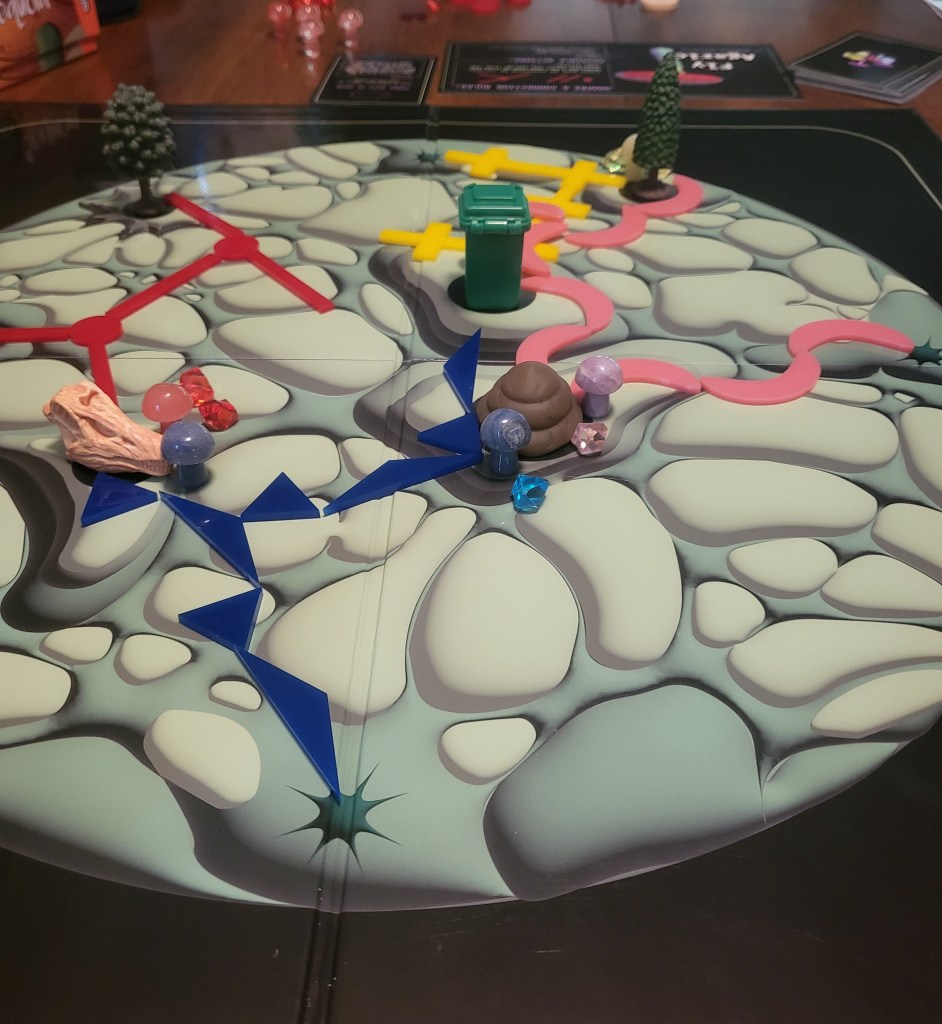 6) The componentry is stellar!! Everything adds a nice tactical element to the game that increases the thematic immersion and enjoyment of the game. The resource tokens are chunky, the mycelial pieces and spores are cool, the 3D fruiting bodies are adorable and appropriately shaped, and the resource spot items are phenomenal! The recycling bin can literally have stuff put in it, and the pile of poop is legitimately squishy! It’s so fun! The art is also very pretty with the inclusion of psychedelic colors.