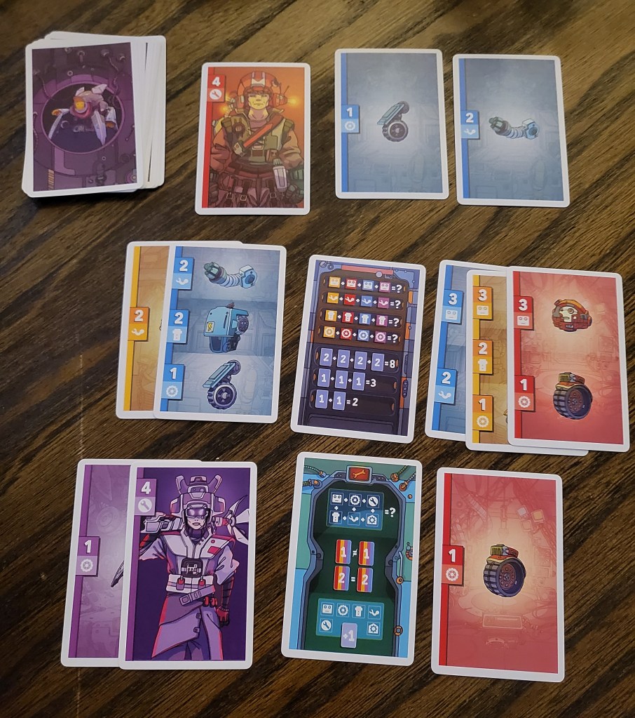 The tricky part is obviously in the placement of the cards. There are four areas, but they are basically separated into a top and bottom – the storage areas on top and the workshop areas on the bottom. In the storage area, you want cards that share icons (representing robot parts), but they have to be all different colors. In the workshop area, you want cards of the same color, but you can’t have any repeating parts or symbols. There’s a little more to scoring than that, but that’s the general idea.