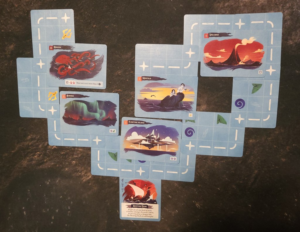 Adventurous is a card laying game where players work to form one continuous path for their ship to sail on while also working to arrange the cards in specific ways for marvels to be constructed.