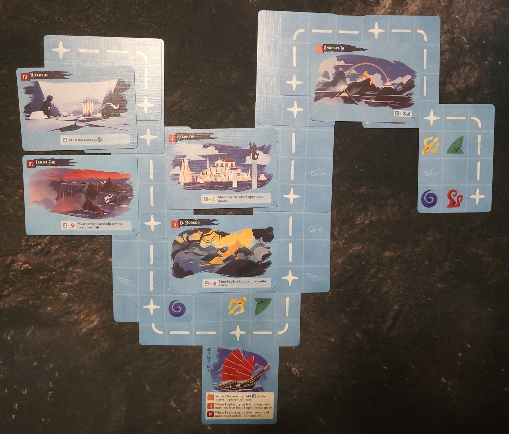 One issue I have with thig game is in terms of replayability. Many of the map card layouts are quite similar so each game feels repetitive in that regard. There’s not a lot of differentiation in the path layout necessarily. The multiple challenge levels, different marvels, and two-sided ship do help with this though. And it’s still a fun puzzle overall, I just wish some of the map cards were more unique in their orientation and patterns.