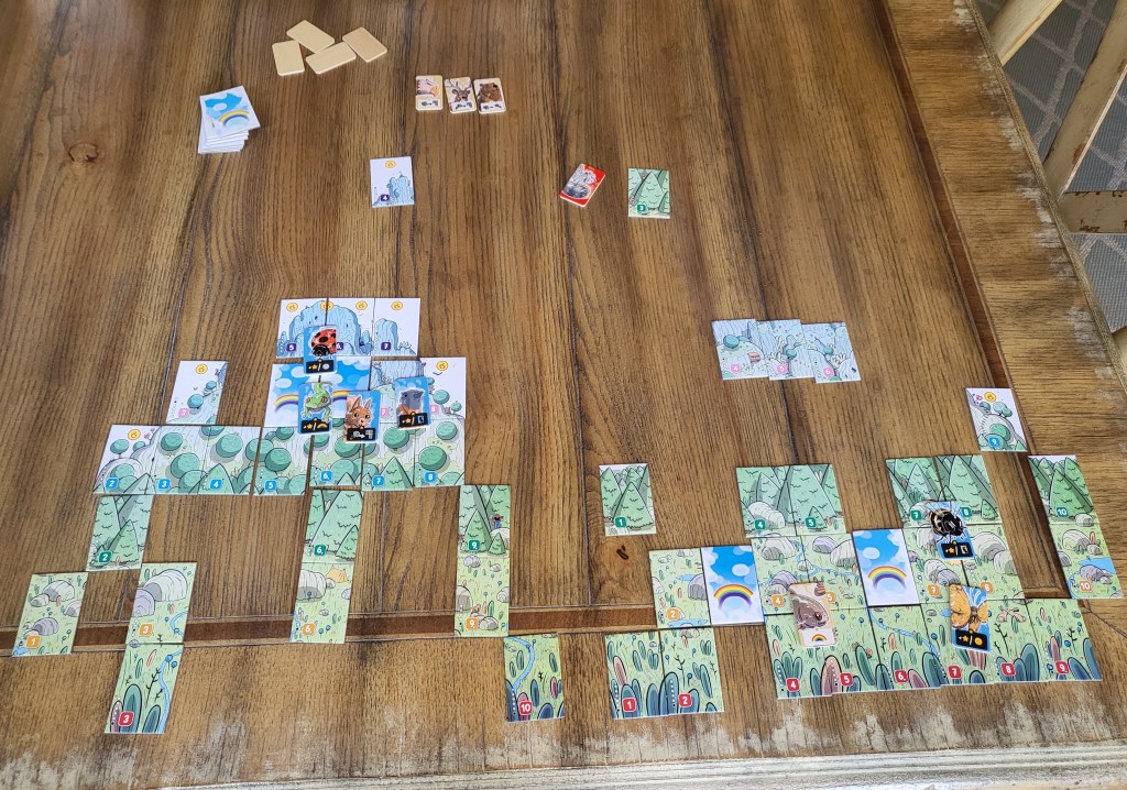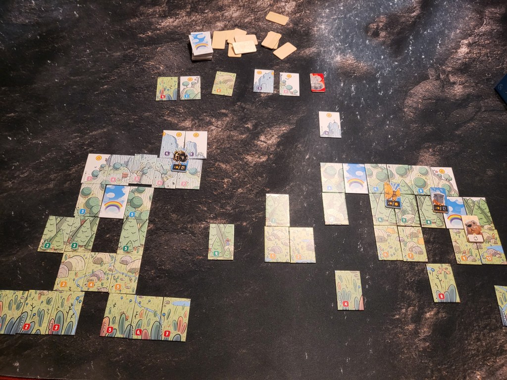 Though simple, the mechanics of this game are pretty neat to me. There is definitely some strategy in which tile to get, which to play from your hand, when to block your opponent, when to get a second chance, where to place rainbows, and which spirit to select, amongst other things. Additionally, I appreciate that there are a few different avenues to try to score points in terms of areas of the board, amount of aggression, personal growth vs. sabotage, and more. I also find it clever that there’s only one of each tile, so you can look at the other players’ tableau and see what they have, what they may be going for, and what you won’t be able to get. It can shape strategy and help guide some decisions.