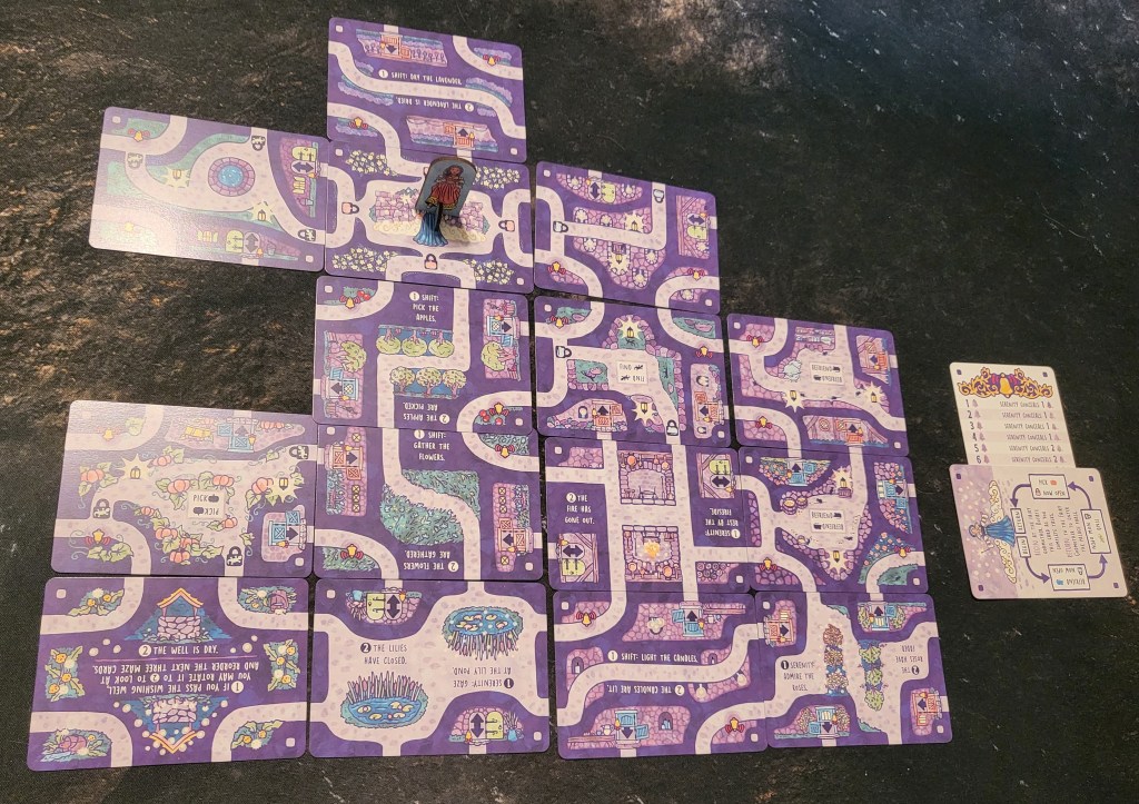 Cinderella at Midnight is a solo only card-laying maze style game set in the magical world of Cinderella! Each turn, players draw cards to add to their maze tableau in the hopes of completing certain tasks in a specific order before time runs out. There are two stages to the game, the garden phase and the palace phase, each with similar objectives but a few changes here and there. You have to successfully complete the garden phase before you can move to the palace phase. Honestly, it’s a really cute and thematic game that’s fun and simple!
