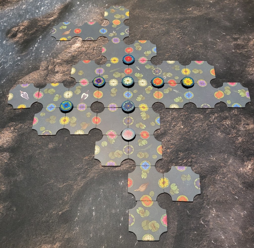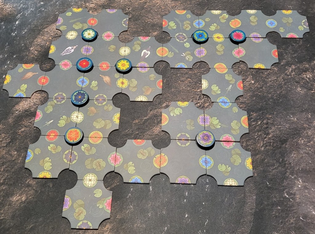 Each time you manage to complete a square of four touching tiles, a blossom opens between them. Based on the four completed flowers on the adjacent tile edges, you select one of those colors and play an unplaced blossom in the hole between those tiles. If all blossoms matching the colors of the surrounding flowers have bloomed, then no blossoms get added. As soon as the eighth blossom opens, the game ends and you calculate your score based on the number of blossoms plus the number of leftover lake tiles that remain unplayed (the discarded tiles do not count). If you happen to run out of tiles before the eighth flower blooms, then you just count the number of blossoms.