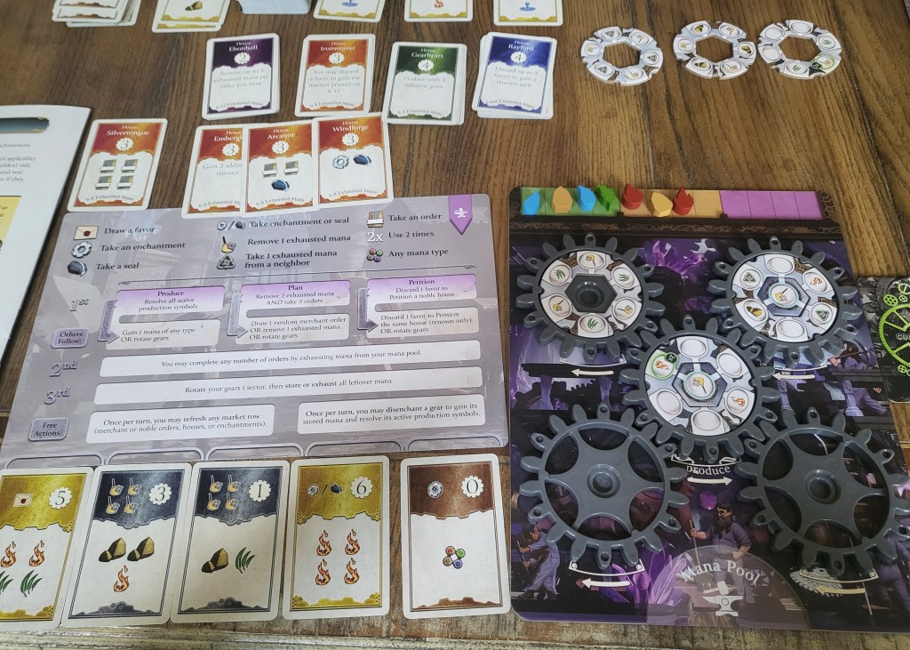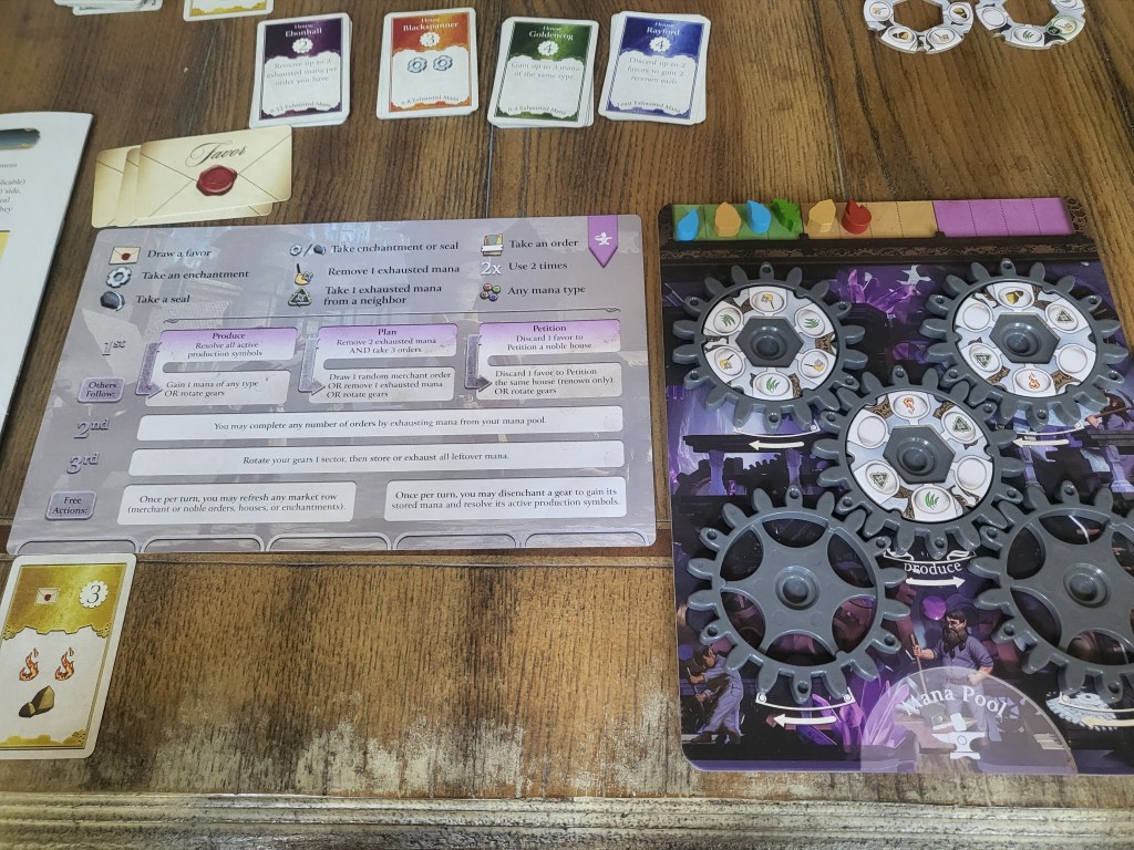 One of the most interesting aspects of this game is that after each player selects one of the three main actions, each other player gets to perform an optional “follow” action. For the produce action, the other players can gain one mana of any type or rotate their gears one sector. For planning, they can draw a random order card, remove one mana from their exhaust, or rotate their gears one sector. After a petition action is taken, other players can discard a favor card to gain the renown (points) shown on the card chosen by the active player (but doesn’t receive any other benefits), or, as always, can advance their gears one sector.