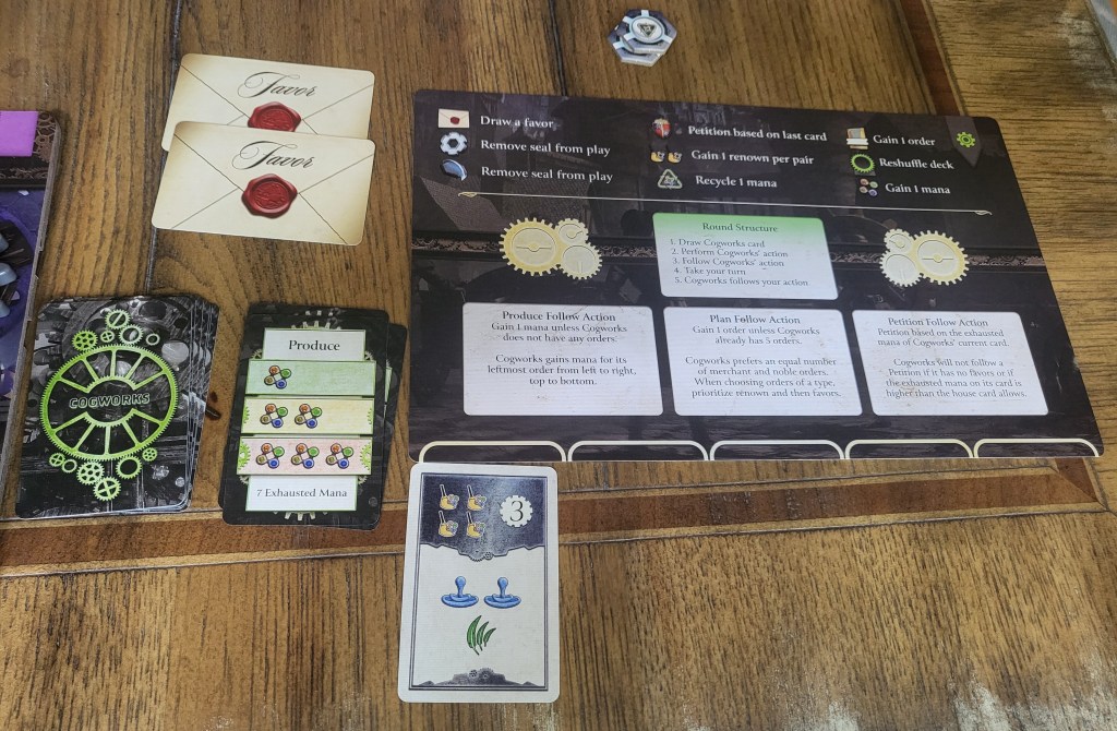 4) These are pretty minor complaints in comparison, but they’re still worth mentioning. If you get unlucky and don’t have many contracts that provide favor cards, it’s hard to get additional points. There are contracts that give renown as a reward, but the main way to gain larger chunks of points in the petition action which always requires a favor card. Also, not being able to store unused mana for the following turn can be a pain. I understand it makes the game more unique and difficult, but if you have a poor combination of contracts and enhancements (which can be luck driven like the favor card issue), not having that mana for the following turn can get frustrating very quickly.