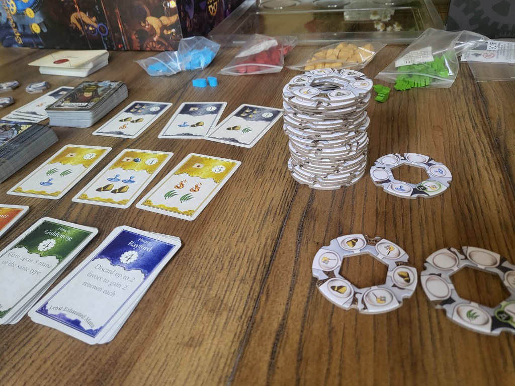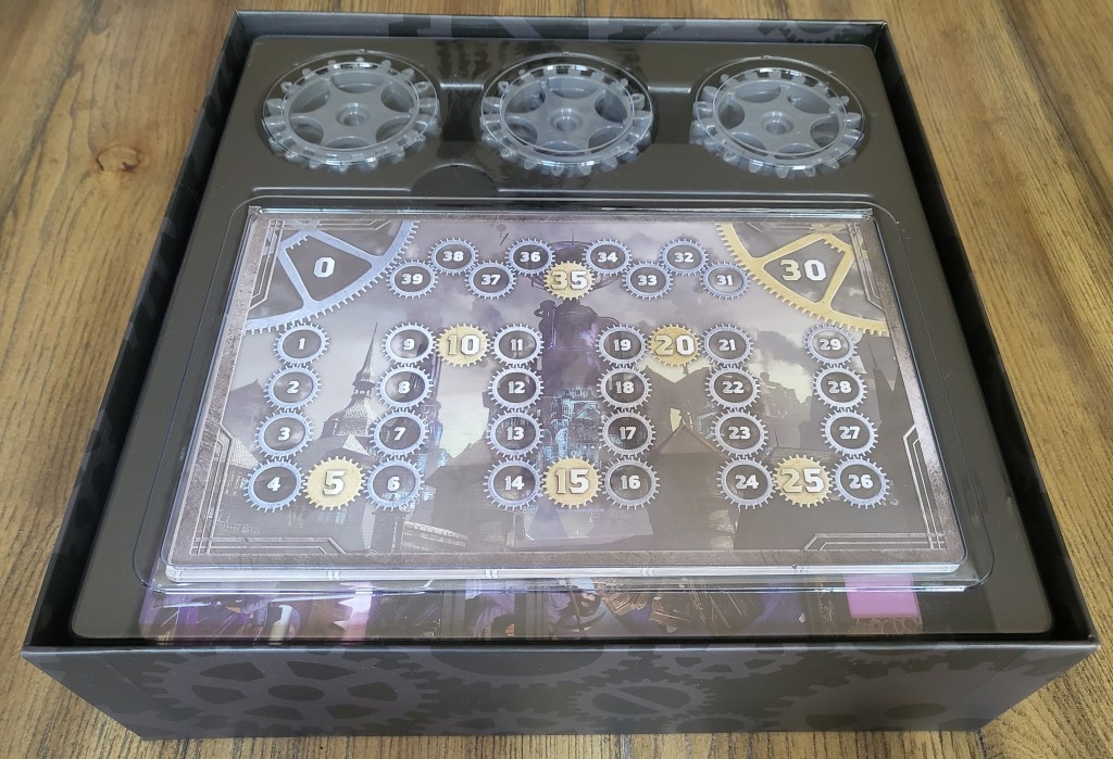 3) The production quality is absolutely stunning, even with the “cheaper version” with plastic gears instead of metal. The wooden resources are nice and chunky, the player boards are well designed and double layered in a very smart and sensible way, and the plastic gears are thick, high quality, and seemingly durable. The artwork is also pretty. The storage solution inside the box is also phenomenal!!
