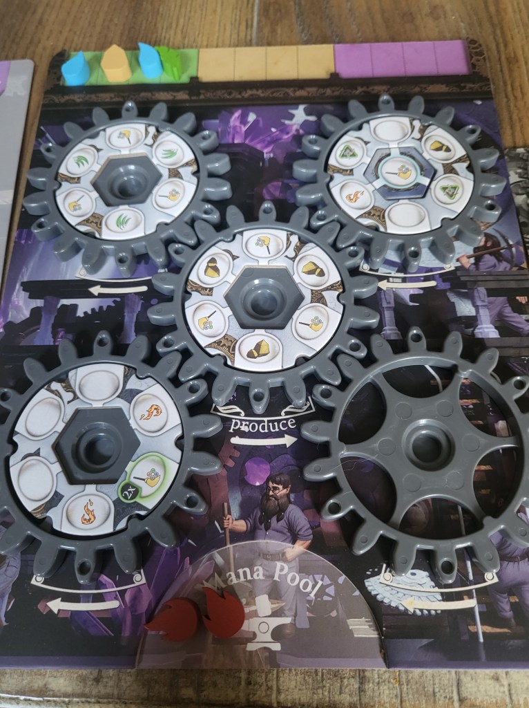 Each player board starts with two “enchanted” gears which equates to having the option to gather resources or other benefits from those gears. If a player chooses to produce on their turn, they obtain everything from their gears that appear in their active sections, AKA the very bottom of each disk. If they gather mana (resources), they place it in the slot at the bottom of their player board (their mana pool) so it can be used to complete contracts this turn. If there is any remaining mana in their mana pool at the end of their turn, it can be placed on existing enchanted gears in open locations, or it must be placed in the exhausted mana section – it can’t be saved for the next turn.