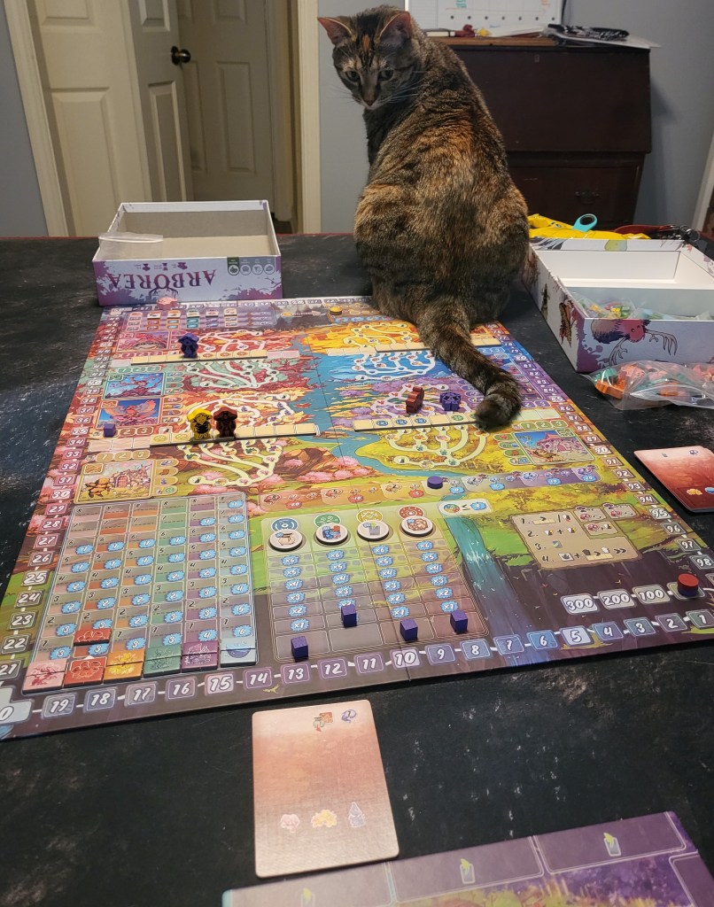 For me, Arborea is a really solid mid-weight (to mid-weight plus) euro option that plays in a decent time frame (90 ish minutes solo) and is not too complicated or convoluted but it’s still very thinky, strategic, and tactical, especially with the creative moving tracks. The game seems to go quickly as you’re enjoying everything you’re doing and the decisions you are making but it still feels like you’re getting stuff done. It’s not too long and not too short (at least for me solo).