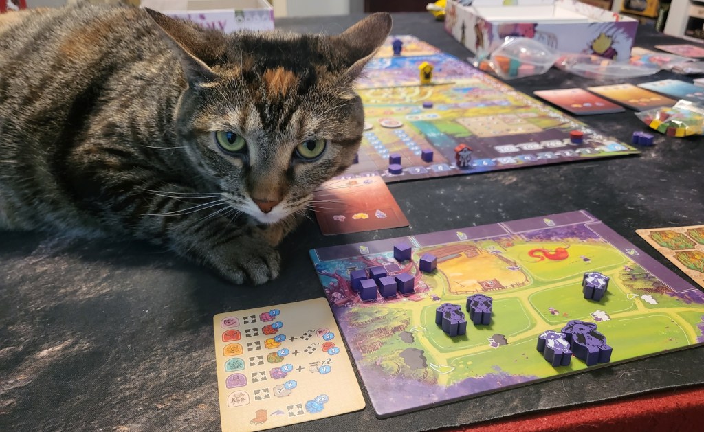 The time tracker aspect is well done and also pretty unique. Each time you pass a spot with a creature and gain that creature, the time tracker advances one. It’s nice to know exactly when it will advance, so you can plan some, and also speed up or slow down the game to some degree. It seems he pulled from this idea some in Windmill Valley.