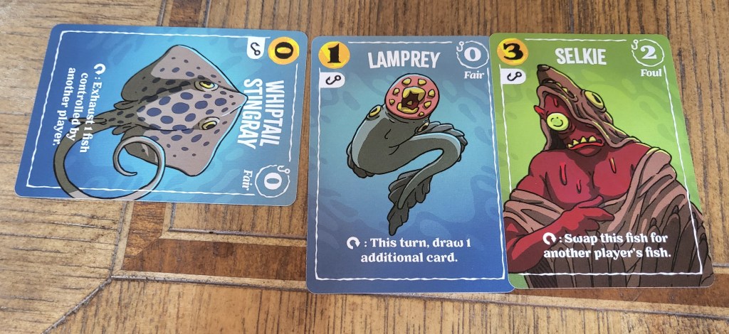 Each round, players fish in different shoals of cards by drawing two from the top and seeing if they have enough strength to catch one of the fish. If they do, they place the fish in front of them, and if not, they throw it back into the sea. Thankfully, the backs of the cards identify a strength range for the associated creatures making it a little easier to predict success or failure. Once a fish is caught, it can be used for its ability (once per game) before that player goes fishing; each ability is unique and has varying effects on the game.