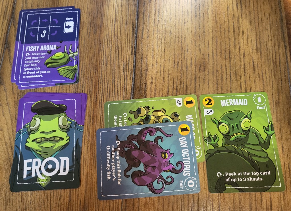 Before I get into some issues with this game, let me identify a few things I do enjoy. As I mentioned, the artwork is awesome and continues the themes and ideas of Deep Regrets; you can tell the two are connected and related (in a good way). The unique abilities on the fish cards are also neat and create some decision making and interaction in the game. I also appreciate that the “The Fisher & The Frod” expansion is available and allows for a solo mode. Frod is very easy to facilitate and keeps the game moving at a good pace.