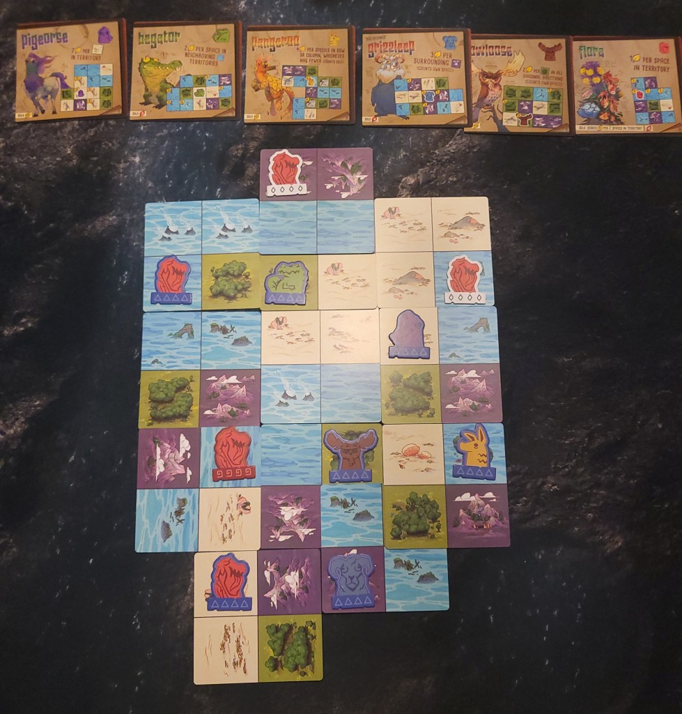 During each turn of the game, players add a card to the map area on the table and then select an available species and place it on the newly added map card. Each species has unique scoring conditions and placement preferences making their assignment decisions quite important. After ten turns (at least in the solo game), the game ends, and scores are calculated based on the species’ preferences and specific scoring conditions. In the solo game, there are also some point modifications required for certain species (I truly don’t know why these exist and I continually forget about them until the end of the game which is super lame).
