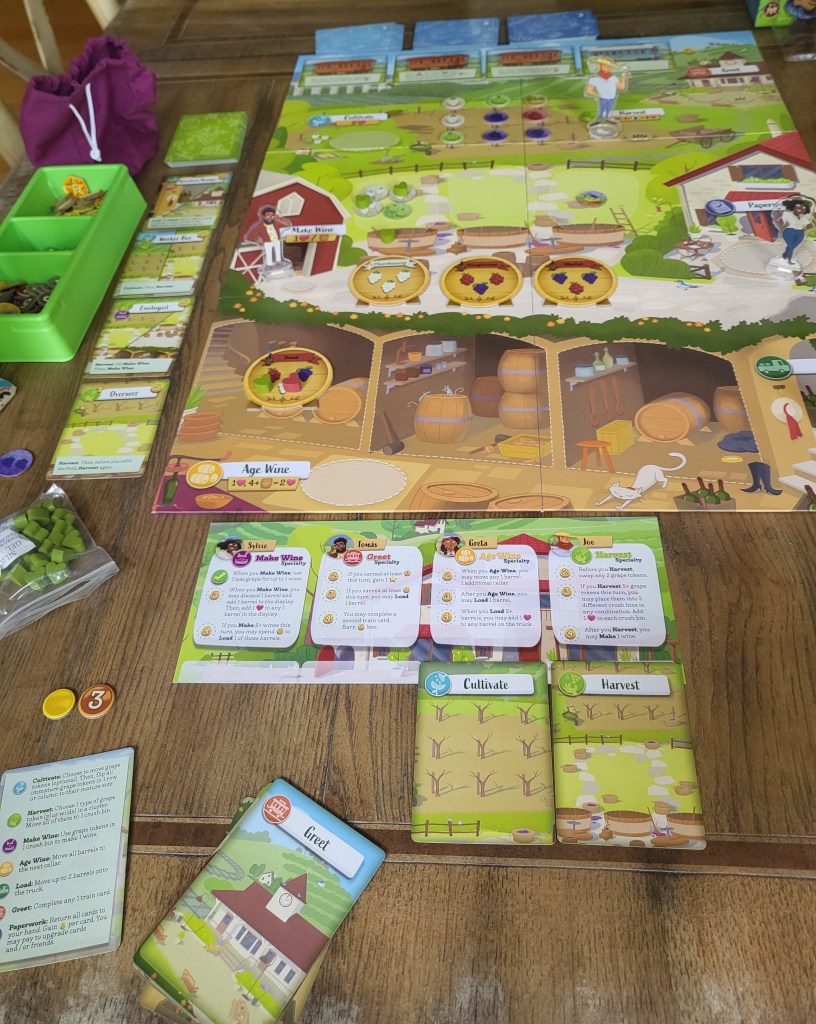 As expected, this game is about making wine. Action options on each turn include cultivating the grapes, harvesting the grapes, making wine, aging wine, loading the truck, greeting guests, and performing paperwork. The mechanics are very easy but there is still a decent amount of decision making required which makes this game enjoyable. There’s definitely some strategy necessary, but there’s also a healthy dose of tactical decisions based on where other players move characters and which locations are available.