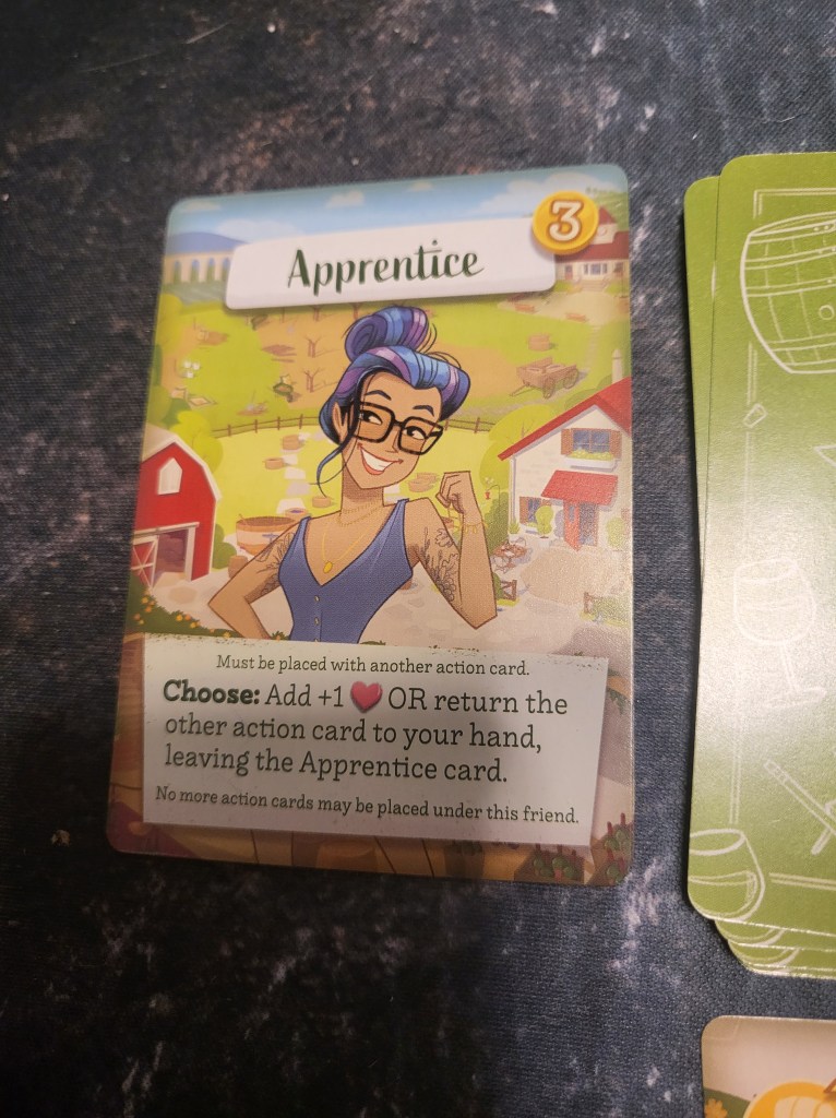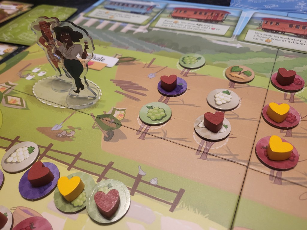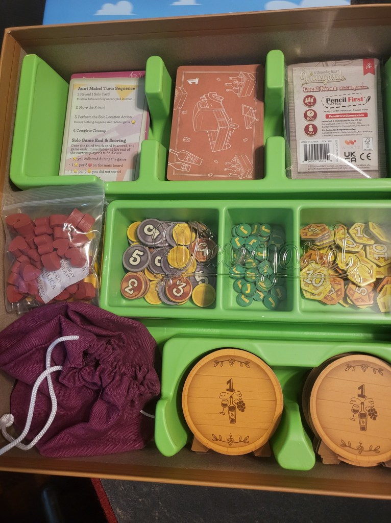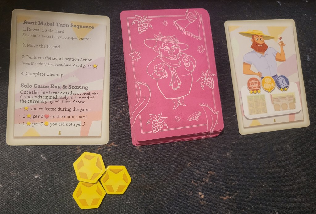 The solo implementation includes an AI player named Aunt Mabel who is visiting your vineyard. Over the course of the game, she collects stars (points) while also moving characters around and taking actions to alter the board state, among other things. I appreciate its inclusion, and it is pretty fun, but the steps to complete some actions are a little convoluted and/or more complicated than they really need to be. I’ve also found Aunt Mabel to be rather difficult to beat (maybe I’m just terrible at this game).