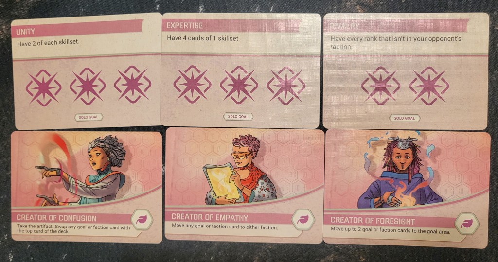 The solo expansion, Aspects of Vision, again, was not my favorite initially, but it’s grown on me. There is a faction or two in this first season that didn’t work well for me solo, but those could easily just not be played with, or you could work to find factions that complement those well. In comparison to season two, these solo cards are different and have unique abilities and goals which seem to be overall easier to achieve but less useful in comparison to season two.