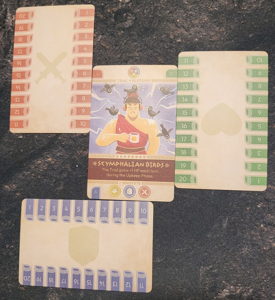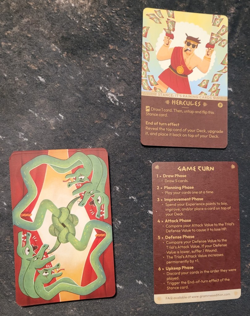 Besides the unique mechanics and twists, I also really appreciate the thematic touches to the game, most notably how each game has one of the twelve labors as your “enemy”, and if you beat it, you can actually acquire it in a future game via experience points. Each labor is also unique and has a harsh ability making the game more challenging while also making each game feel somewhat different. It can also be played as a twelve chapter campaign which is cool.