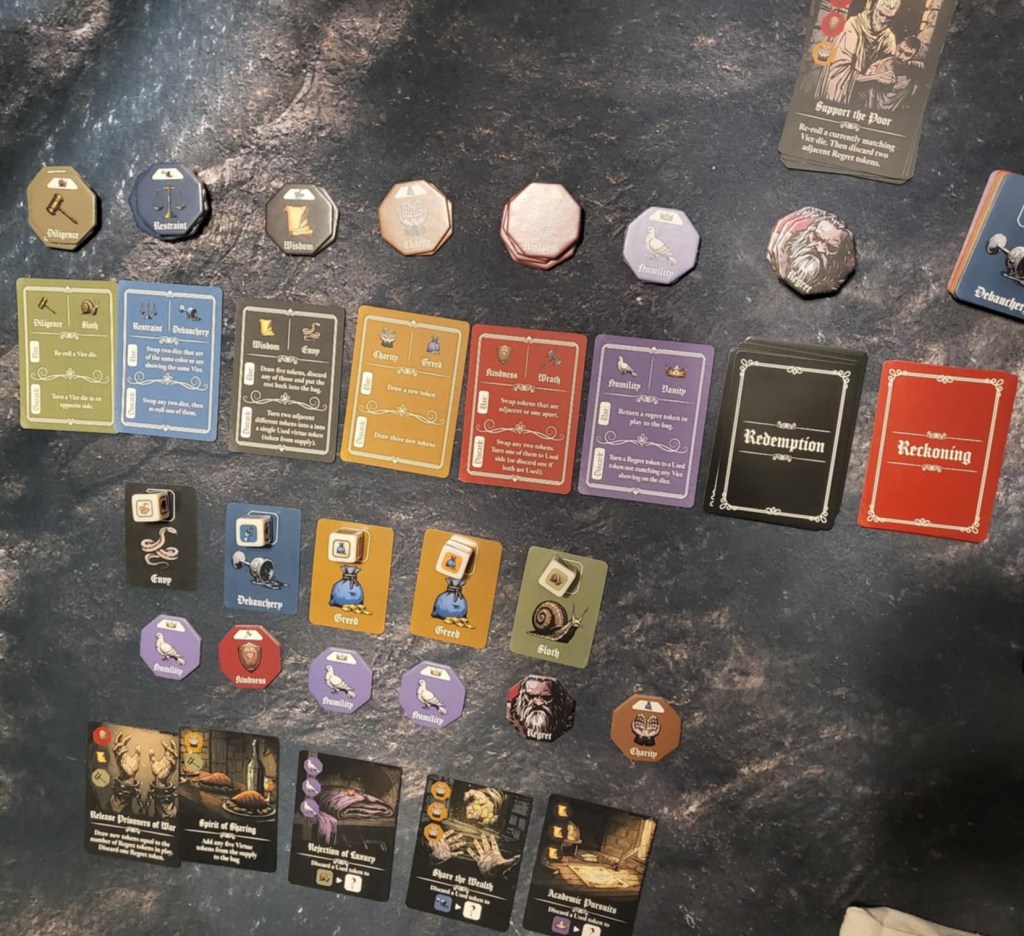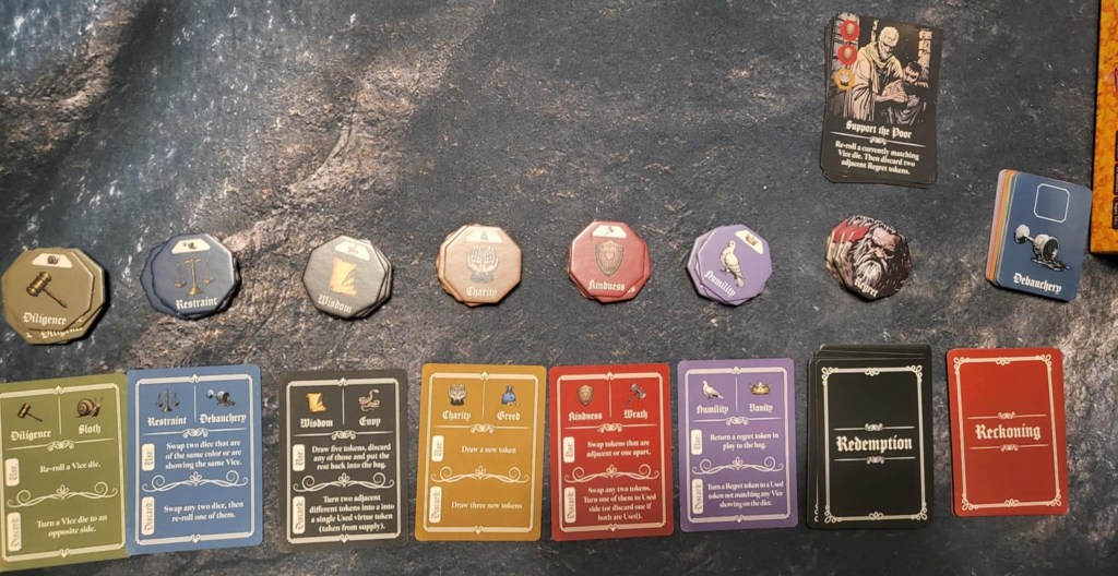 To start the game, the player places all vice dice in the draw bag and then draws one at a time. After one die is drawn, the player also draws two redemption cards and selects one to use for that round. This continues until the player has five dice and five redemption cards. The rest of the dice can then be put aside or back in the box, as the bag has to be freed up for the next step: tokens.