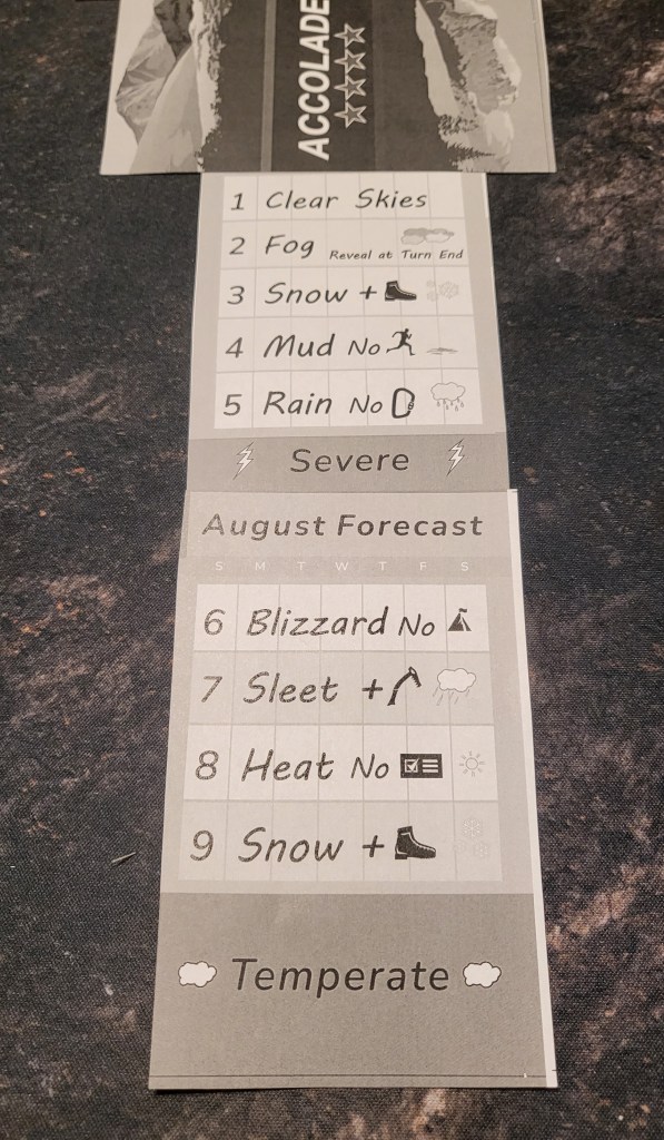 Besides the base game, there are a few mini expansion module type things included like weather cards, advanced hikers, etc. The advanced hikers are interesting, but I really enjoy the weather cards. They increase the difficulty and force some extra strategic plays and tactical thinking.
