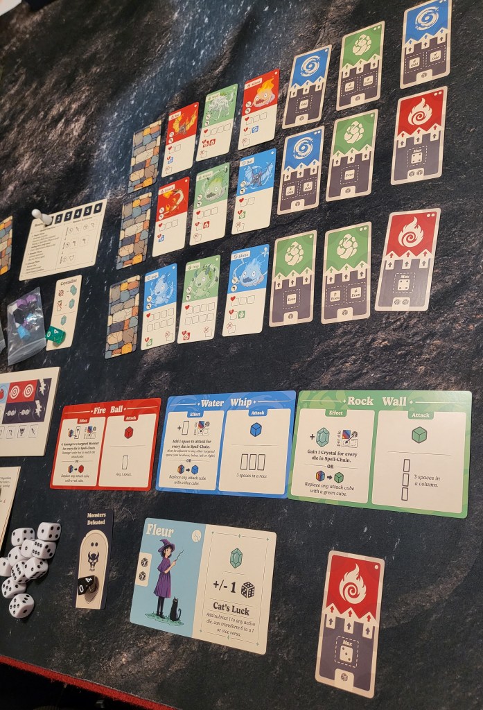 At the start of each round, the player rolls a certain number of dice based on their characters and spells and then plays spell cards from their hand to form a (max) 3×3 grid of spell cards. At any time, players can utilize their dice to activate the spells and attack the monsters. Each enemy requires specific combinations and configurations of colors and numbers of attack cubes, making each one a unique challenge.