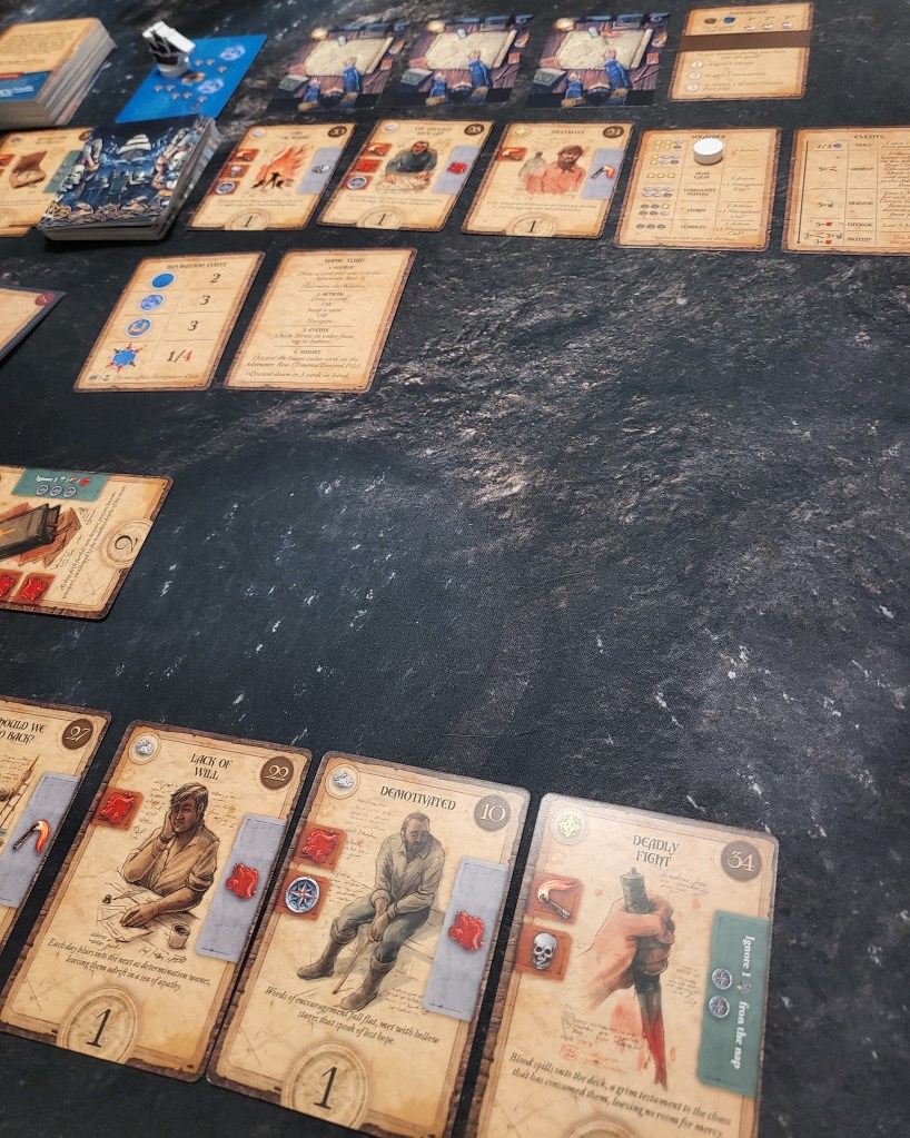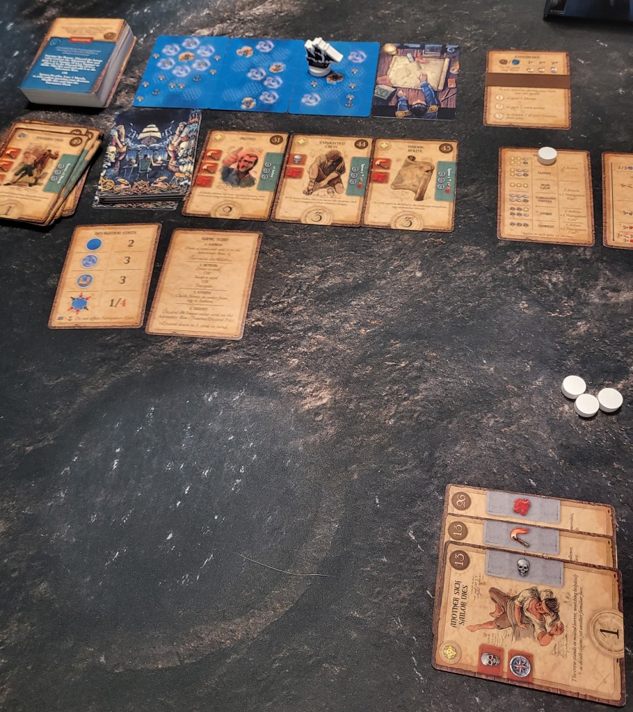 The player wins if they successfully make it to the final destination island, but they lose if mutiny ever occurs or if they run out of action cards which symbolize morale. Besides what I mentioned, there are encounter cards that are quite fun and can be positive or negative, and there are experience points that you can gain to aid you in your journey, among a few other things.