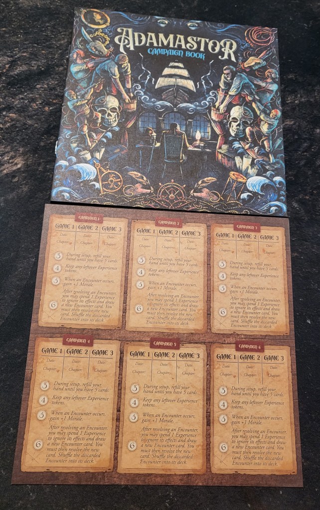 Adamastor is a hand management and action selection game where the player is trying to traverse the sea and reach an island. Along the way, they can gain skills or (the more likely option) they’ll have mutiny, disease, or some other problem that causes them to fail before they reach their final destination.